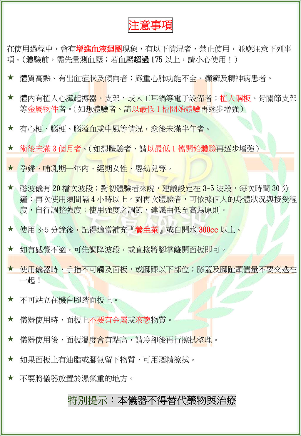 - 磁波儀有20檔次波段;對初體驗者來說,建議設定在3~5波段,每次時間30分鐘;再次使用須間隔4小時以上。對再次體驗者,可依據個人的身體狀況與接受程度,自行調整強度;使用強度之調節,建議由低至高為原則。